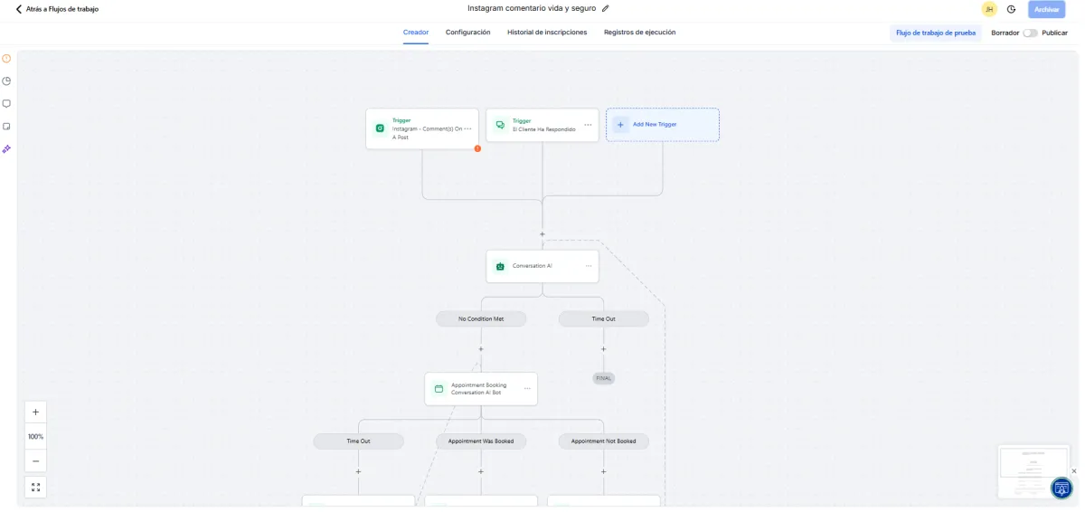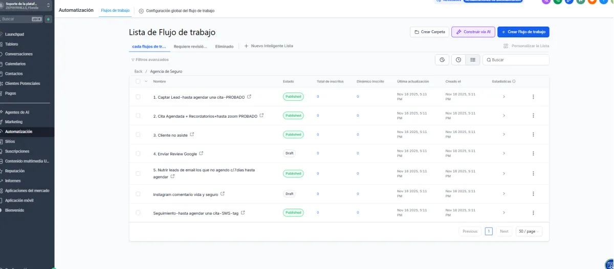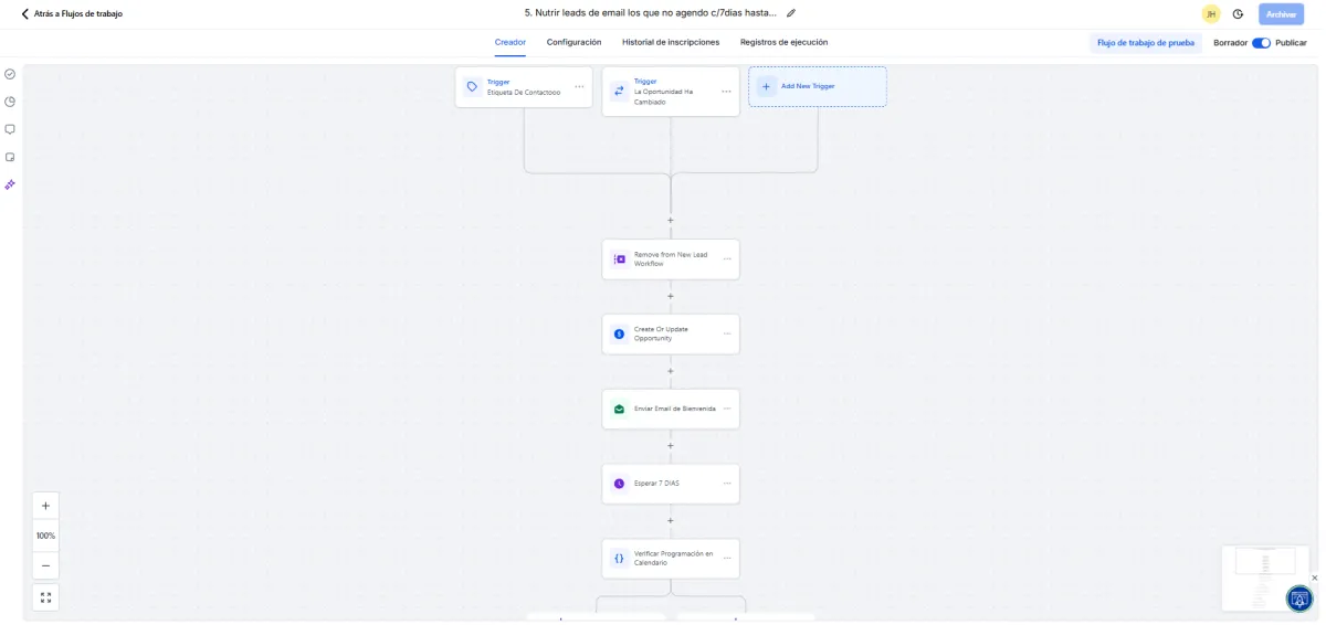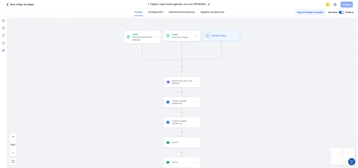 Un workflow puede activarse por: ✔ Un formulario enviado ✔ Una cita agendada ✔ Un cambio de etapa en el pipeline ✔ Un mensaje recibido (SMS, WhatsApp, Instagram, Facebook) ✔ Una etiqueta nueva ✔ Un comentario en redes sociales ✔ Un evento del calendario
