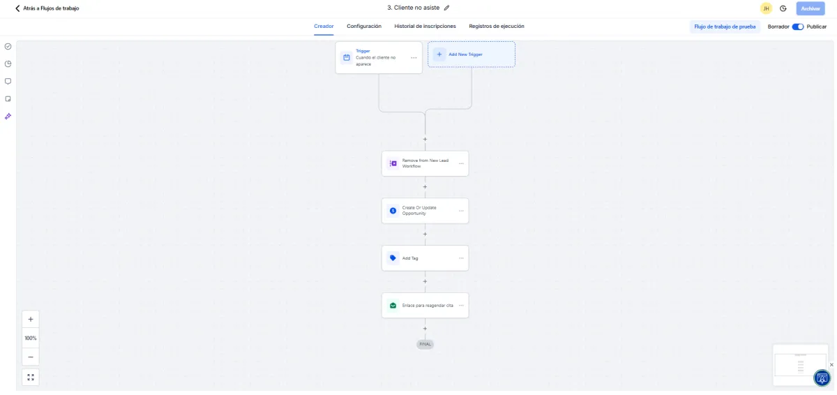 Si un cliente no llegó a la cita, este workflow envía mensajes para reagendar y recuperar la oportunidad. Objetivo: evitar perder leads por inasistencia.